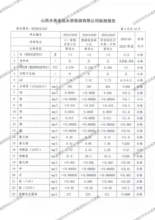 忻州城區(qū)公共供水水源水、出廠水、管網水、管網末梢水2024年12月份水質信息公示