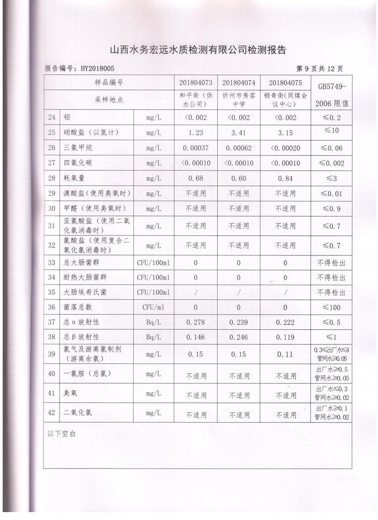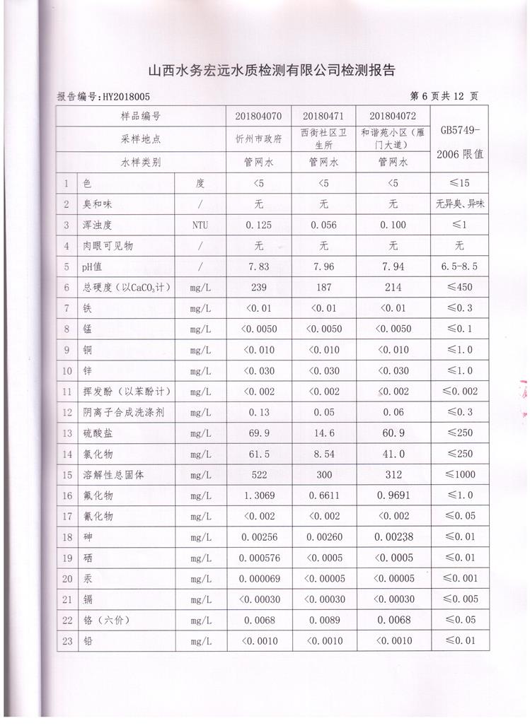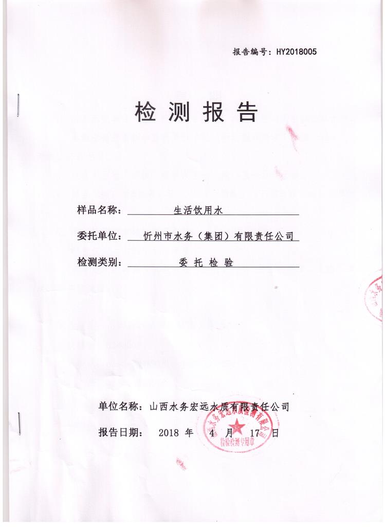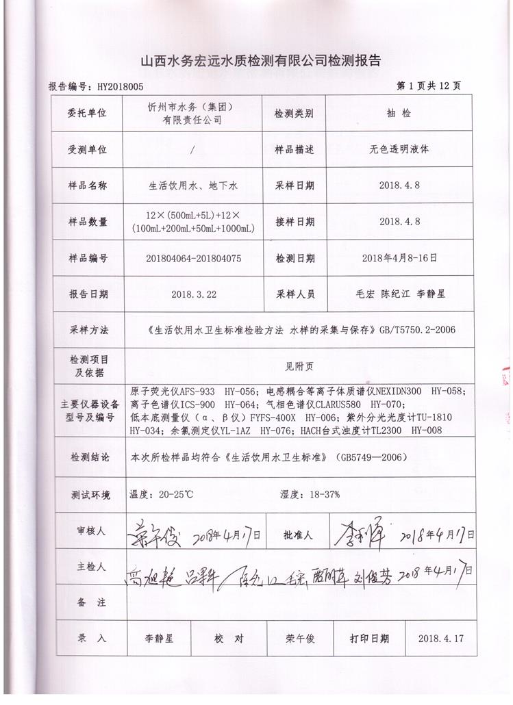 忻州城區(qū)公共供水水源水、出廠水、管網(wǎng)水、管網(wǎng)末梢水2018年4月份水質信息公示