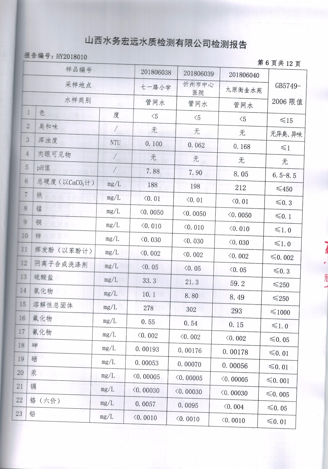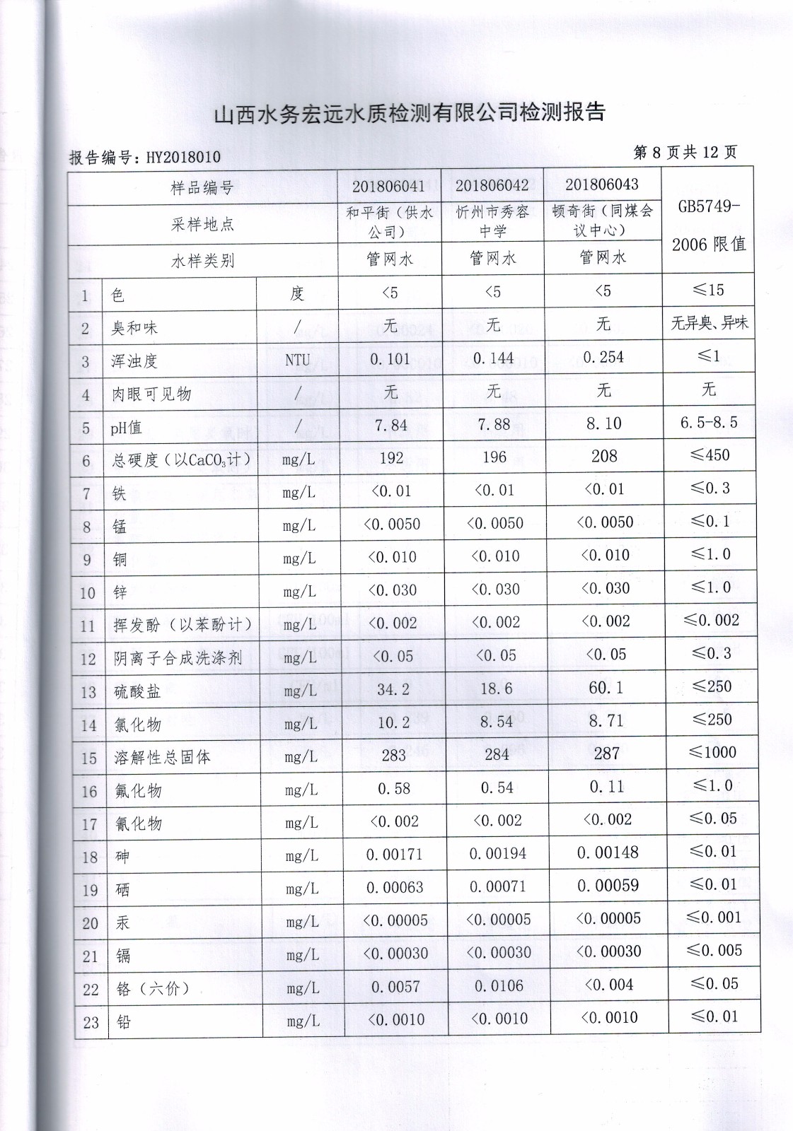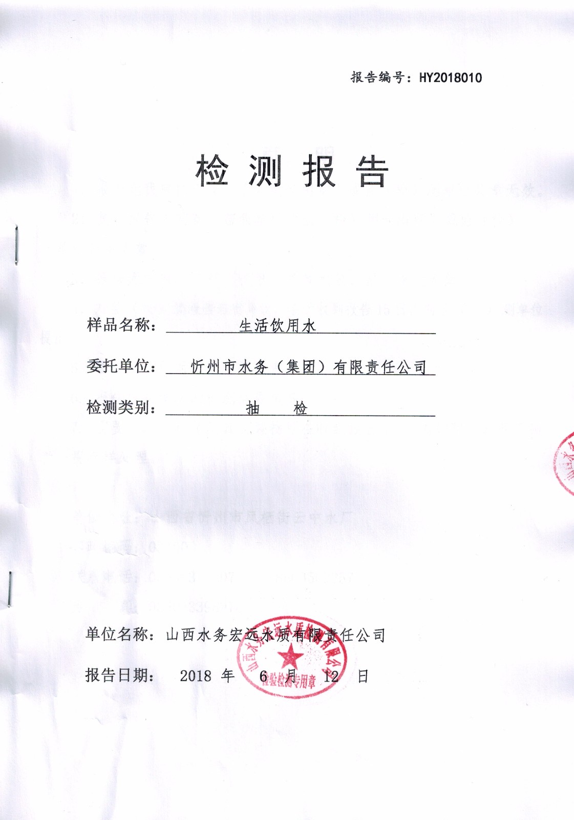 忻州城區(qū)公共供水水源水、出廠水、管網水、管網末梢水2018年6月份水質信息公示