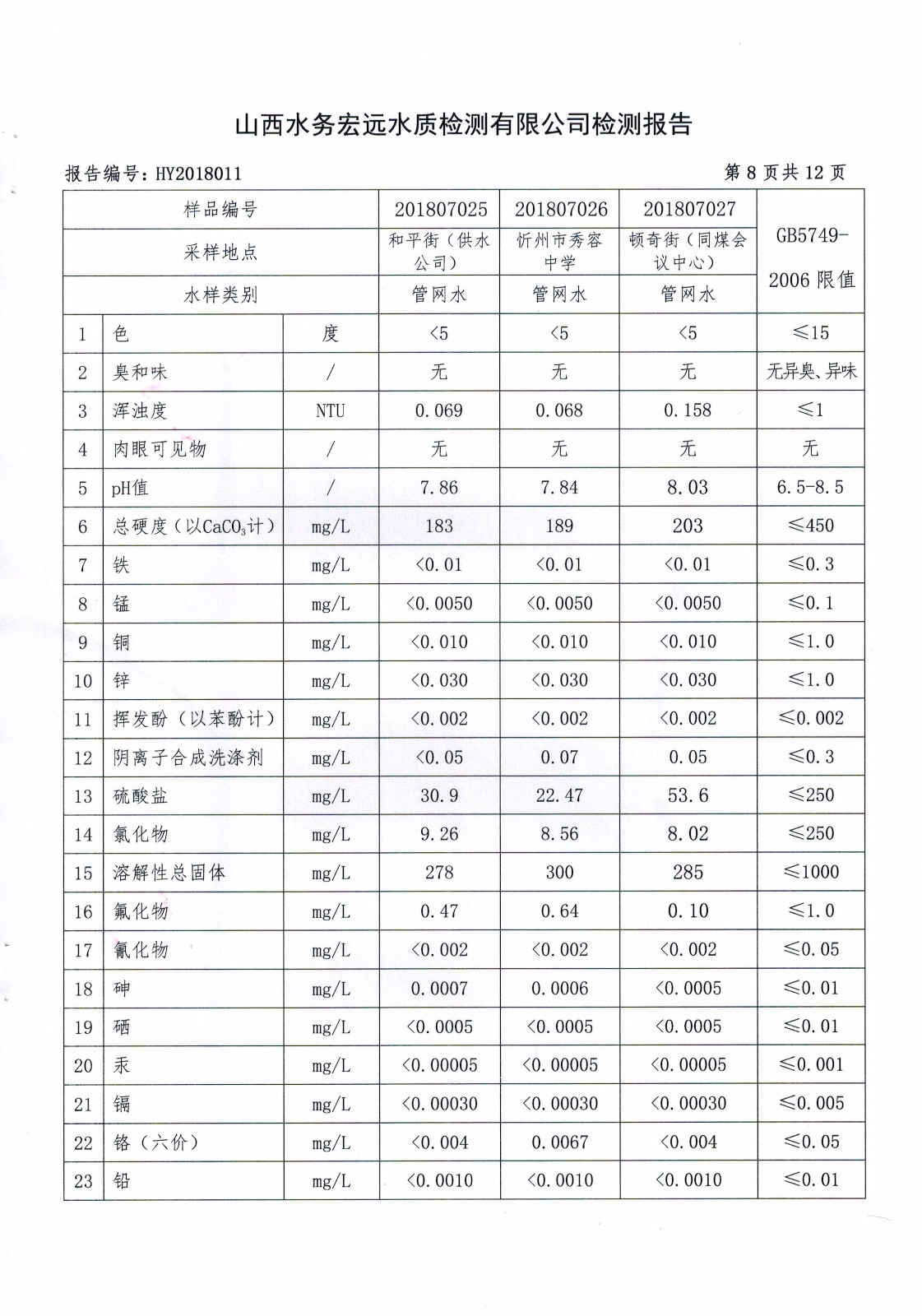 忻州城區(qū)公共供水水源水、出廠水、管網(wǎng)水、管網(wǎng)末梢水2018年7月份水質(zhì)信息公示