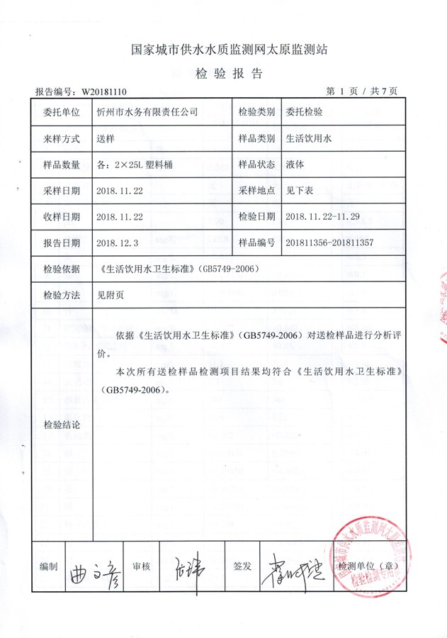 2018年忻州城區(qū)公共供水南水廠、云中水廠出廠水106項水質全分析信息公示