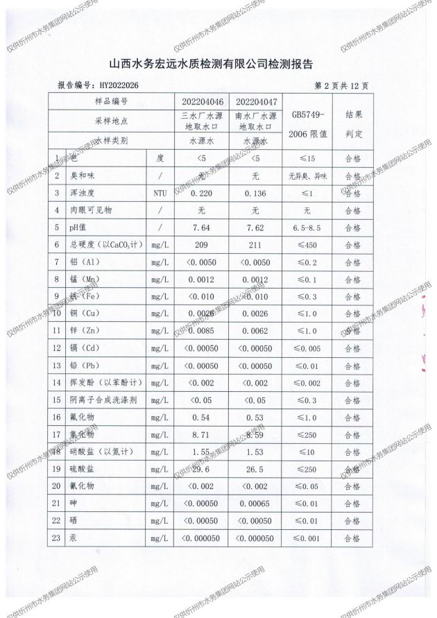 忻州城區(qū)公共供水水源水、出廠水、管網(wǎng)水、管網(wǎng)末梢水2022年4月份水質(zhì)信息公示