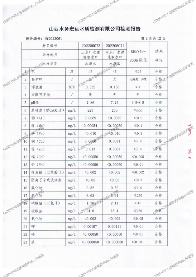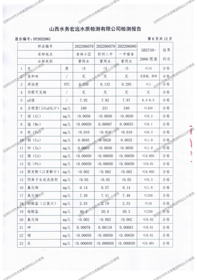 忻州城區(qū)公共供水水源水、出廠水、管網(wǎng)水、管網(wǎng)末梢水2022年6月份水質信息公示