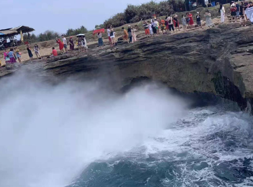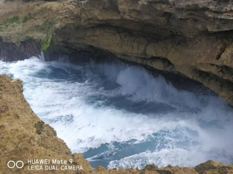 惡魔的眼淚是一個小的懸崖,但因?yàn)槌D甑暮K疀_刷,形成了一個開口圓形的形狀。懸崖底端也有被海水沖刷出的洞穴,因?yàn)閴簭?qiáng)的擠壓,漲潮的時候海浪在這里被沖出幾十米高。我們運(yùn)氣很好看到在陽光折射下水霧中的彩虹,而且還拍了不少美麗的照片。