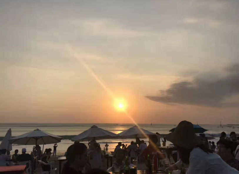最后一站仍是海邊,而且,是擁有全球十大最美落日之一的金巴蘭海灘。傍晚的金巴蘭,夕陽斜斜地掛在海天一線的地方,云層和海水被染得金黃,一層層地變換著顏色,滿目金黃,即使是不太感性的我也為之驚嘆不已。右前方的海灘上,一條機(jī)場跑道筆直延伸入海,銀色的飛機(jī)不斷起降,在斜陽的照耀下劃出一道道美麗的弧線。沙灘上,一桌桌的盛宴已經(jīng)一字排開,就等著我們入席了。當(dāng)晚恰逢我們家駒哥哥的生日,同事們紛紛為他送上祝福。燭光搖曳,海風(fēng)輕柔地?fù)崤骖a,靜靜地,看夕陽一點(diǎn)點(diǎn)地落入海中,此時此刻,吃什么已不再重要。難忘的,最是那一抹夕陽醉了的溫柔。